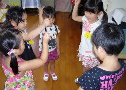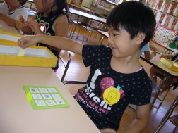 ビンゴカードに動物の絵をはり、ビンゴゲームの準備中。