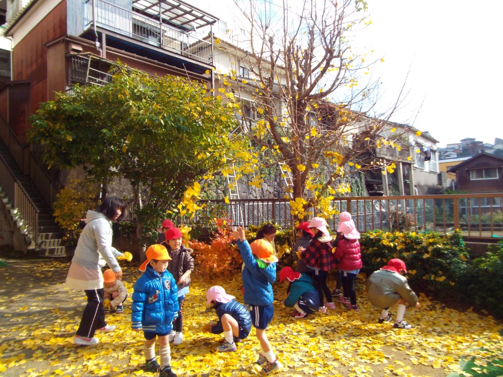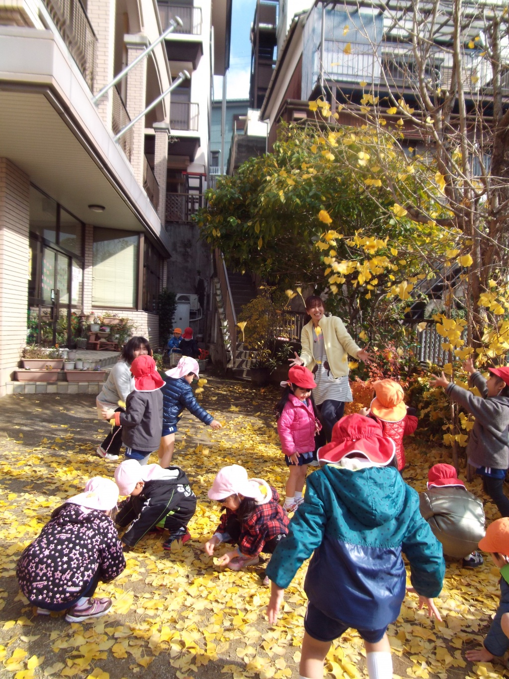 昨日の午後は、雪のように降りつもった銀杏で思う存分、あそびました。