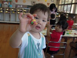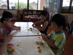きれいな色の粘土を使って果物を作ったり、色をまぜて、こねるなど