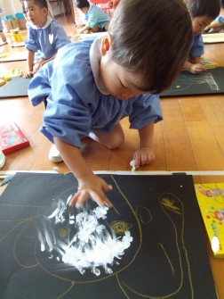 先生に「今日は絵の具を指で塗ってもいいよ」と言われ、