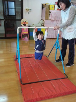 ☆さて、今日のパピークラブ(未就園児教室)では、鉄棒やマットやフープで