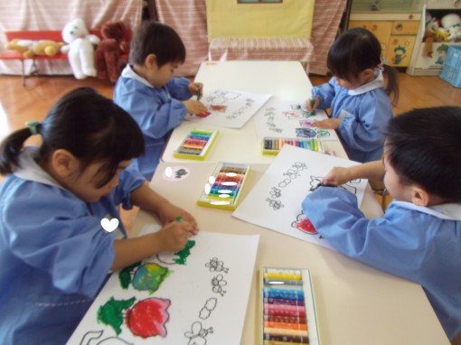 年少児は、クレパスの蓋の開け方から練習して、色ぬりをしました。
