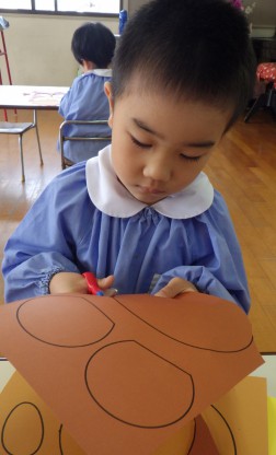 輪郭をはさみで切り、色をクレパスでぬりました( ..)φ
