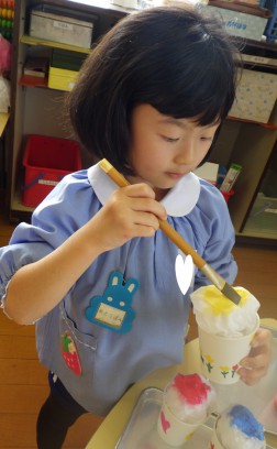 霧吹きで少し水をかけ絵の具で色をつけて、かき氷の“みつ”にしました(^^)