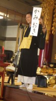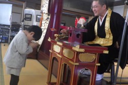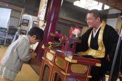 聖徳保育園の年長児がお供えするのを、正座して手を合わせて見ています。