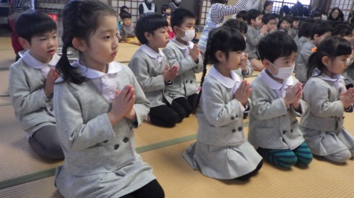 聖徳保育園年長児のお当番の子がお供えする間、正座し手を合わせます。