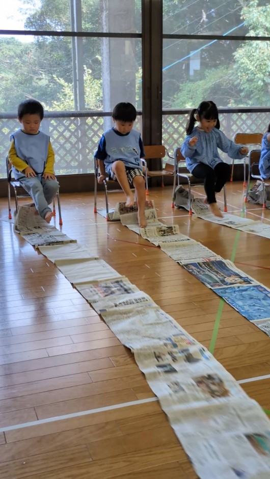 足をたくさん動かして、長くつなげた新聞を椅子の下まで入れます。