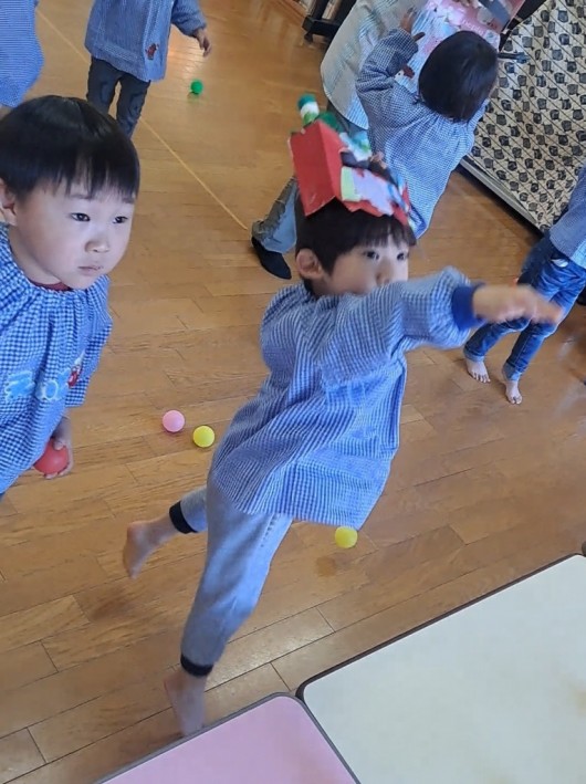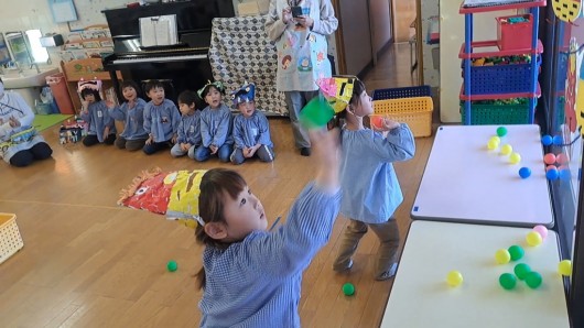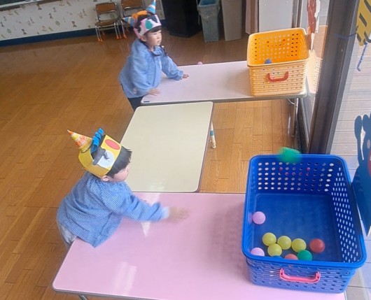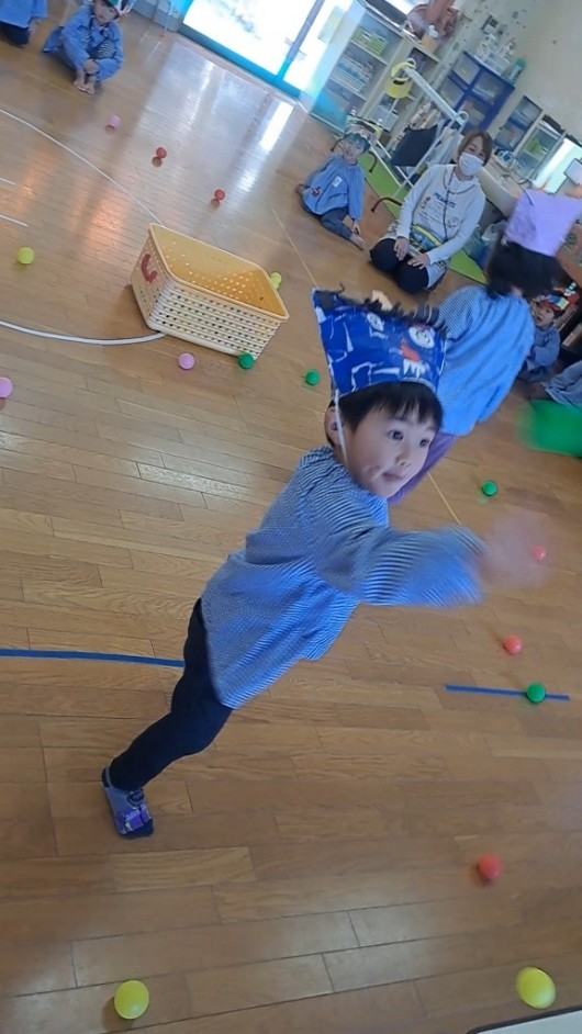まずは、りす、ばんびぐみさんから。チームに分かれて玉入れをしましたよ!