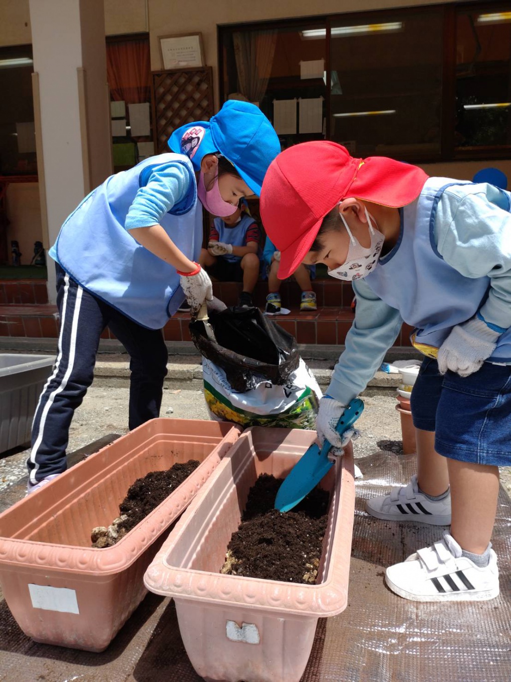 今日きりん・ぞう・らいおん組さんは、自分たちで育てる野菜と花の種を植えました(*^^*)